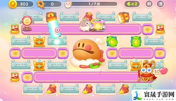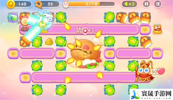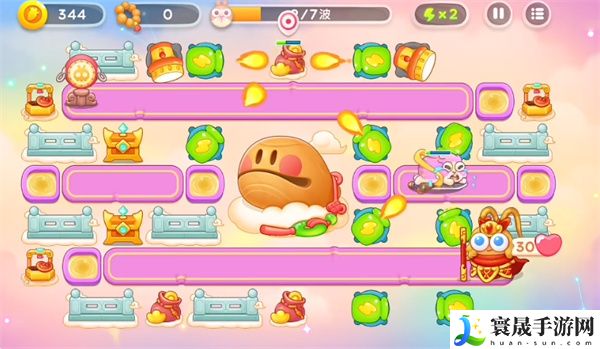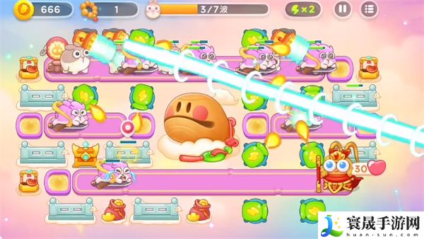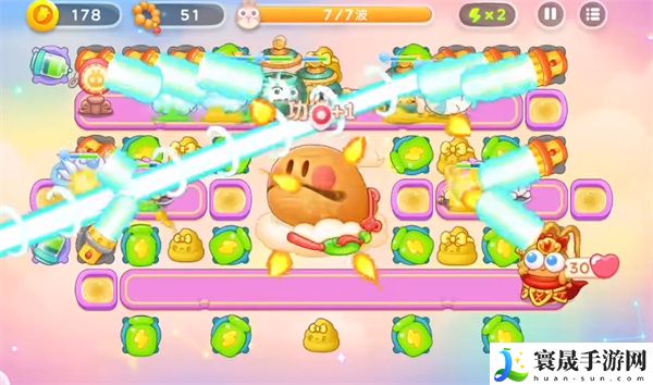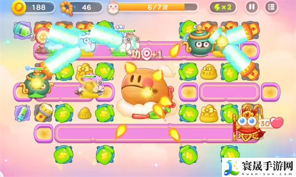 6、最后一波按照下图阵容进行放置炮台能够有效清理小怪,抓准时间锁定木鱼攻击即可。