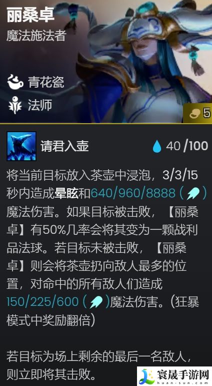 阵容后期的上限就来自于丽桑卓,其实并不是需要其稳定控制,而是其技能再6/8法加持下,与佐伊、辛德拉配合,一轮一技能就可带走敌方多枚棋子(均需要对位),如果是8法下基本除了3星4/5费前排坦,没有能抗的住的。