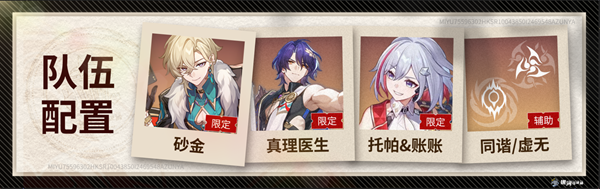 这个组合是之前就已经出现的追击组合,砂金入队之后低氪度(0+0)的情况下也终于能够满足真理医生的基本需求——凑至少三个负面效果了。所以辅助位可以自由选择同谐或者虚无。并且在这个队伍中,输出流砂金也能获得不错的体验。