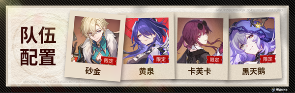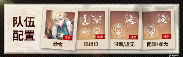 这个思路就是正常的三保一常规队,砂金作为生存位入队,没有什么特别好说明的。辅助搭配主要是看输出位的需要去选择。