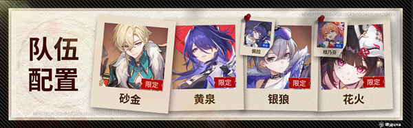 这个组合是黄泉的常规组合,砂金进队担任生存位,提供生存、辅助、输出、充能等多重定位功能。