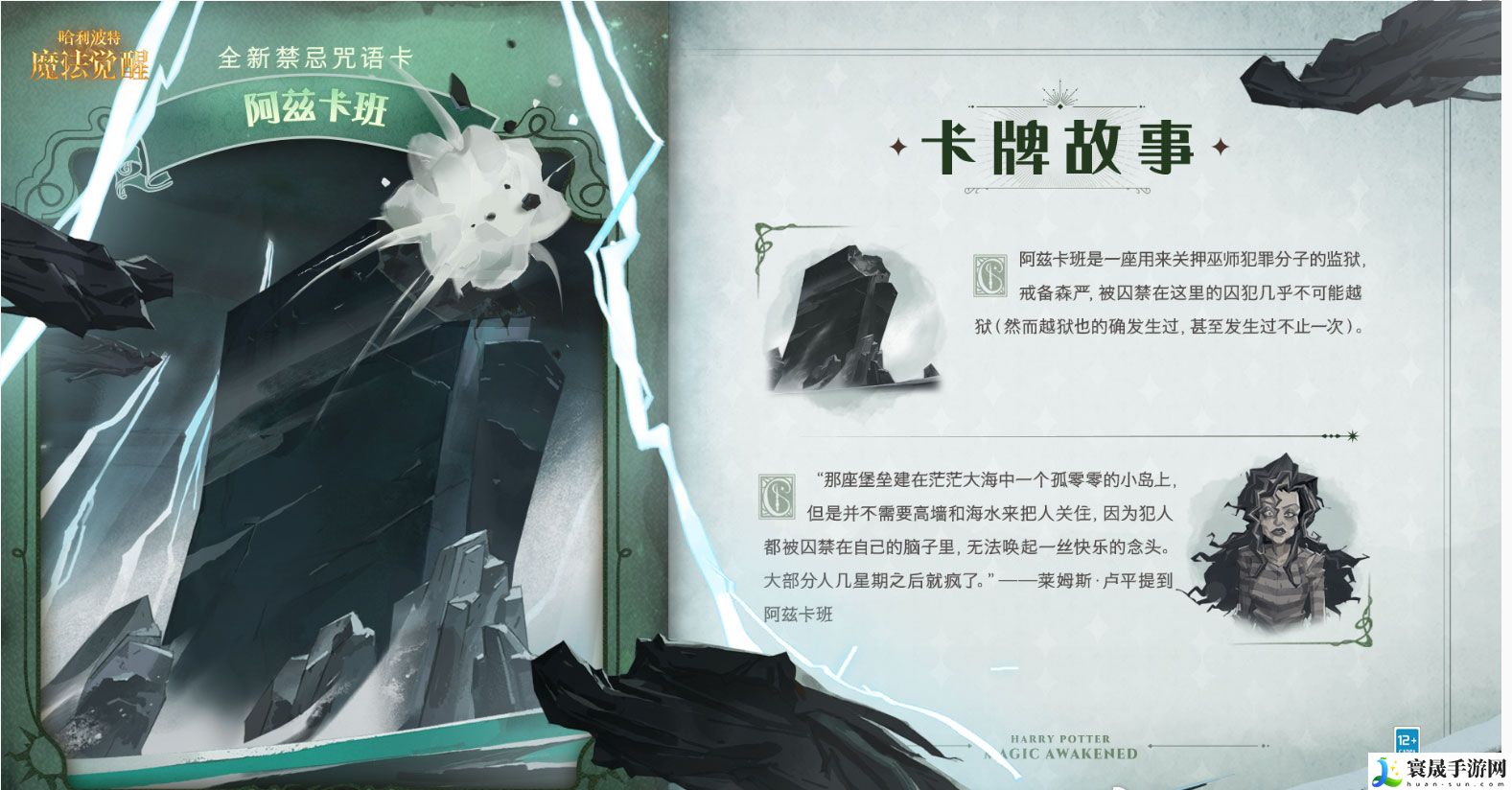 阿兹卡班是一座用来关押巫师犯罪分子的**,戒备森严,被囚禁在这里的囚犯几乎不可能越狱。全新禁忌咒语卡「阿兹卡班」即将上线,请巫师务必保持警惕,切勿接近危险区域!