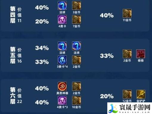 (40%)奥恩神器+2金币、(40%)4费卡*3+10金币、(20%)12金币+金铲铲