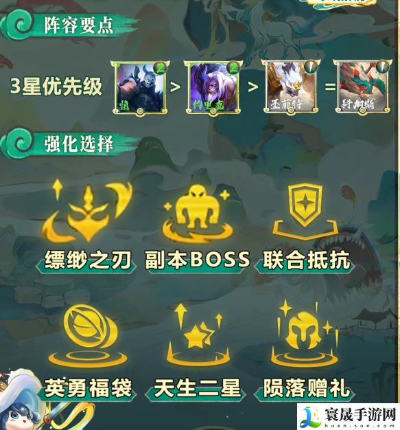 ②如果有【副本BOSS】强化,可以考虑将其他擎天英雄拿去献祭给【约里克】,没有【副本BOSS】直接擎天一排站前排,画圣慧站在最后一排中间即可。