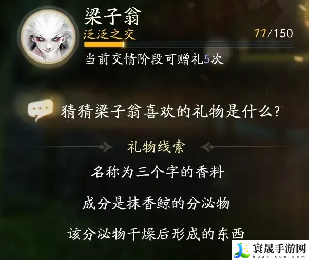 礼物线索二:名称为三个字的香料,成分是抹香鲸的分泌物,该分泌物干燥后形成的东西。
