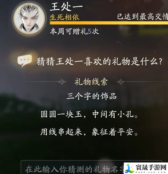 礼物线索三:三个字的饰品,圆圆一块玉,中间有小孔。用线串起来,象征着平安。