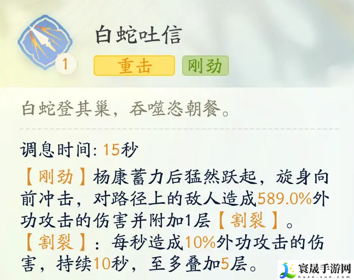 1、普攻-白蛇吐信:对敌人造成伤害,并施加割裂debuff。
