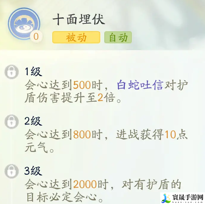 3、被动-十面埋伏:根据杨康的会心数值来提升伤害等效果。