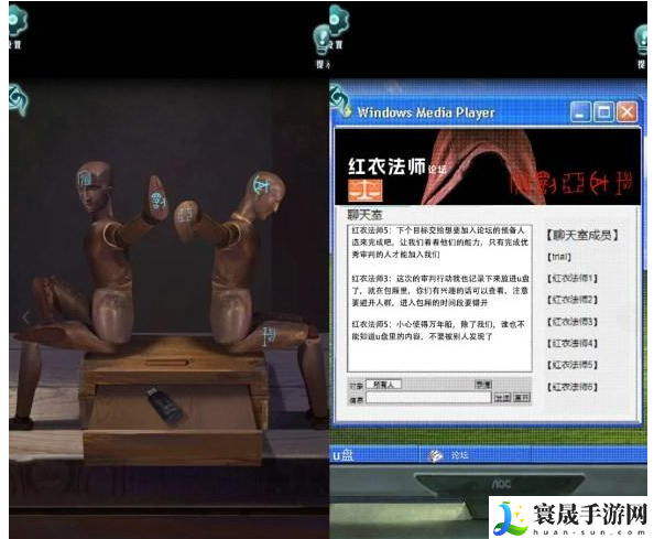 7.包厢:小刀划开沙发上抱枕得到木偶头,墙上架子第二排完成游戏↓↑↓↓↑↓↑↑,得到光盘,放入主机打开视频〈高能〉,视频右上角有信息(653214&243153)打开论坛,密码两数相减是410061,论坛页面右上角信息,墙角处的柜子放上木偶头打开第二层抽屉得到紫光笔,根据论坛信息调整木偶姿势得到U盘插入主机。