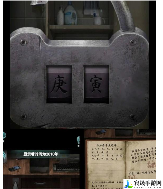 2.网吧:左边电脑桌上得到黑色碎片,前台右边木龛里面财神爷移动一下得到蓝色碎片,前台靠墙的鱼缸得到信息打开放财神爷的柜子点263次得到八卦盘,墙上挂的钟表根据指针颜色打开桌子左下角的柜子得到油灰铲,地上笔记本内信息,根据提示时间2010年天干地支余数打开卫生间的储物柜庚寅,移开水桶得到红色碎片,用油灰铲撬开活动瓷砖得到房间门钥匙打开卧室。