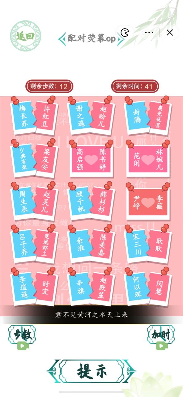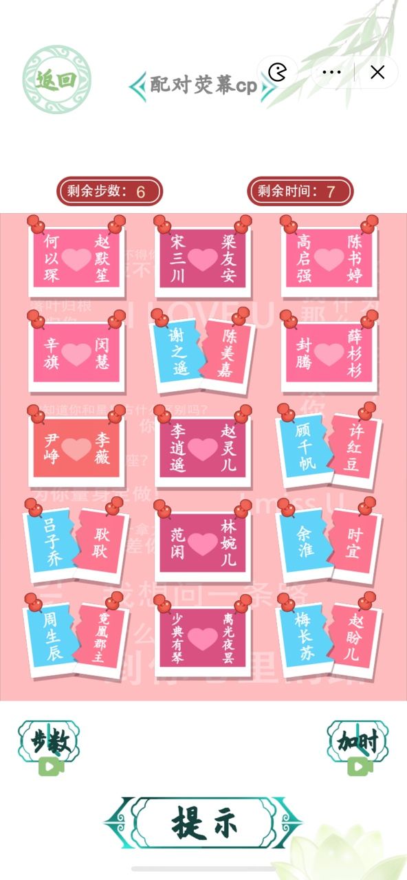 汉字找茬王红蓝cp配对需要我们在有限的步数内完成所有荧幕名字的CP配对,这次的配对荧幕CP相较上次更有趣,这里的人物都是大家熟悉的名星角色,现在给到大家一份完整的配对名单,我们只需要按上面的名单来配对就可以通关了!