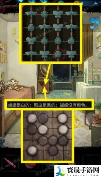 17、点击有红蝴蝶的柜子,根据笔记本里的提示和棋盘上黑白子的分布,调整密码锁,点击纸人使她停止运动。17