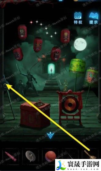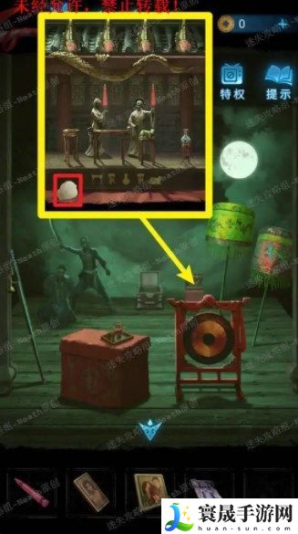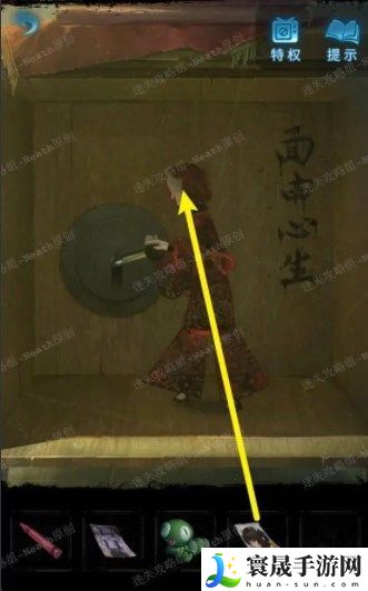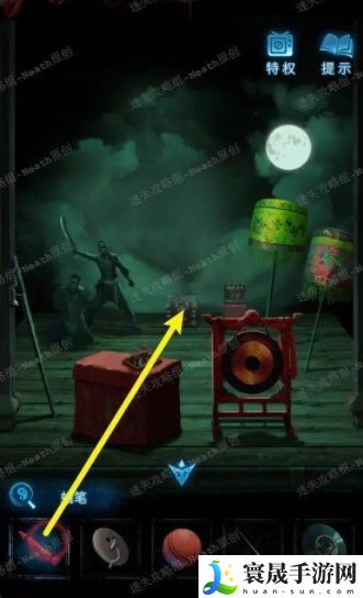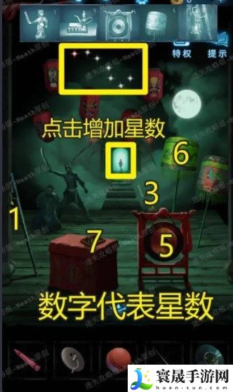 9、根据电视里的画面对应的数字,点击远处的女主角,同时观察星星的数量,在第1颗星星时点击铃铛,第3颗星星时点击人偶,第5颗星星时点击铜锣,第6颗星星时点击黄色的伞,第7颗星星时点击酒壶。9