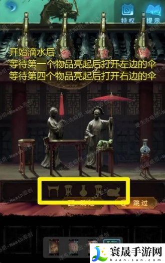 32、根据底下提示的顺序使雨点落到正确位置,雨伞可避免雨滴落下,调整带数字机关可以控制雨滴的落下顺序,初始设置如下,点击龙头开始滴水,等待第一个物品亮起后打开左边的伞,等待第四个物品亮起后打开有边的伞,完成后拿走【蝴蝶玉】。3232.1