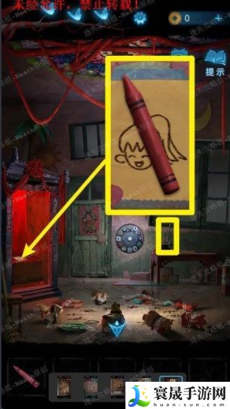1、进入左边的树洞,拿走右边香炉上插着的【铁条】,查看地上的玩具,记住12甲子的位置,左边笔记本上拿走【蜡笔】。1