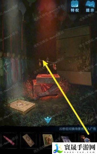 22、进入裂缝把【木偶】挂到天平上,观察右边人偶脸上的字,观察右边柜子上笔记本的最后一页,观察柜子上物品的排列。22 22.1