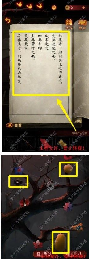 34.根据此前的《鹅幻戏术》书中的提示,可知水果的采摘顺序,树上的水果会不断随机变化,在限定时间内容,按照:硬壳水果→瓜果→辛辣之物→黄汁水果→浆果的顺序来点击即可完成小游戏并获取【水果】。34 34.1