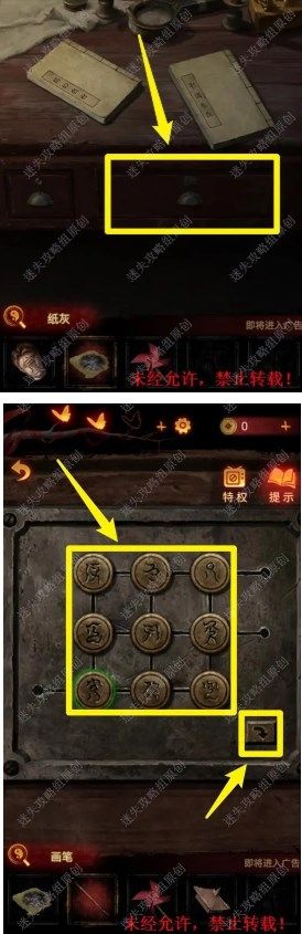 9.点击抽屉进入解谜,九宫格中的棋子可以上下左右移动(需要有移动的空间),点击右下角的箭头按钮可以转动并改动棋子的方向,将九宫格调整为下图所示样子即可。9 9.1