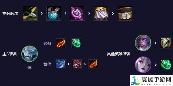 慎带装羊刀龙刀必备,最后一件可以双羊刀或者帽子或者巨杀,双羊刀则是打持久战力,帽子巨杀快速过前排极致伤害,前排约里克带石像鬼狂徒龙牙等肉装,后面补上莫甘娜和天将,莫甘娜带鬼书补充重伤。