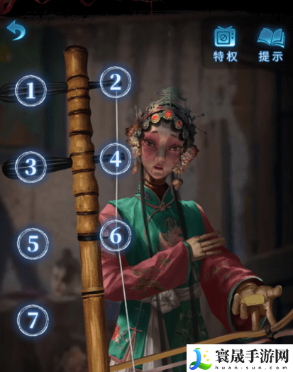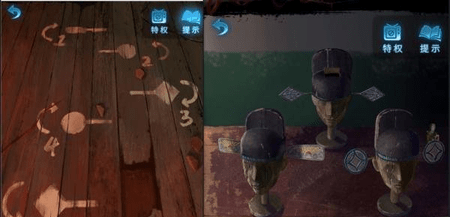 7、点击右侧桌上的木偶头,根据之前地板上的图案分别开始点击头上的摆件,箭头向上就往上拉,反之则相反。