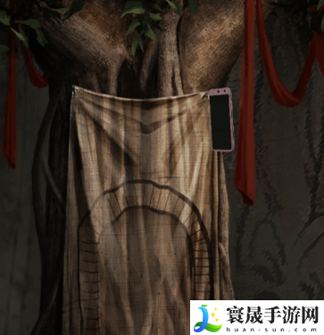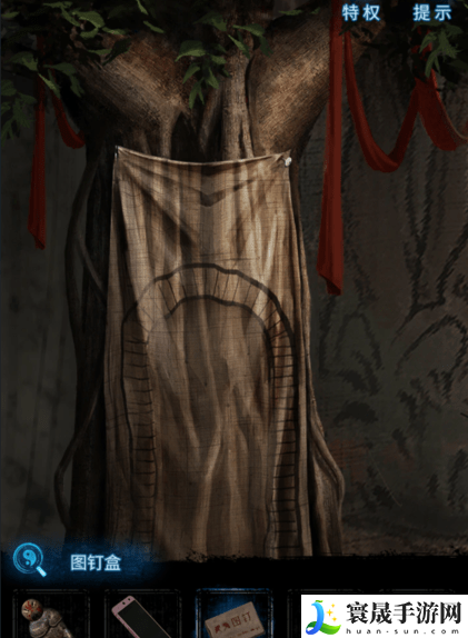 4、获得图钉盒,回到舞台上,点击左侧的树,使用图钉盒以及手机将布钉好,树中的机关开启,出现一道门。