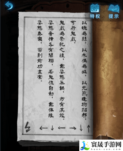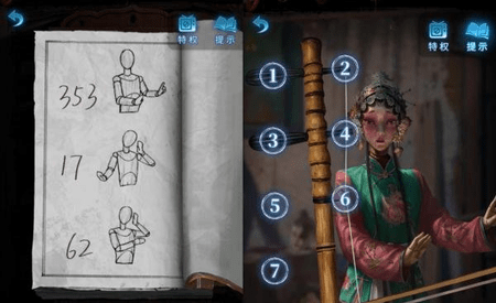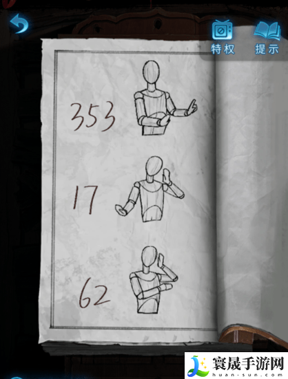 6、回到树后的房间,点击装戏服柜子上吊着的书,打开书本,记录图案:电←↓←→↓↑,继续翻页,记录木偶的姿势以及数字 353 17 62。