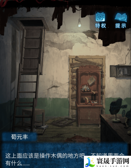 13、回到树后的房间,将凳子放在左侧,使用书本和手机垫在凳子下方,拉下楼梯,进入上面。