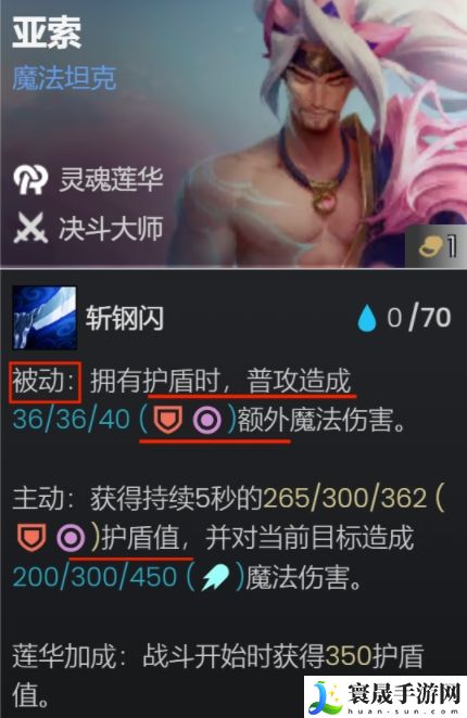 而这套阵容的核心棋子亚索,其被动技能在有护盾时普攻就可造成额外伤害,这样亚索在开局有灵魂莲华组合护盾,释放技能还有护盾,且亚索只有0/70的法力值,这对前排来说技能释放频率会非常快,可以说盾一直不会断,亚索的坦度会极其优质。