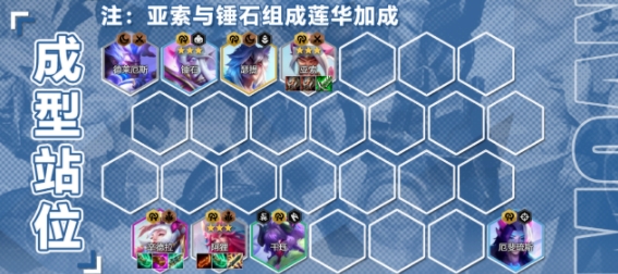 亚索3星后就卡着50金币升人口,6人口补锤石与厄斐琉斯开出5莲华羁绊,记得亚索一定链接锤石,不然没有坦度这是核心。