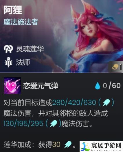 阵容前期输出C位选择了阿狸,阿狸是1费棋子可与亚索一起追3星,3星单体技能伤害较高,还有小群伤,中期压制力比较不错。