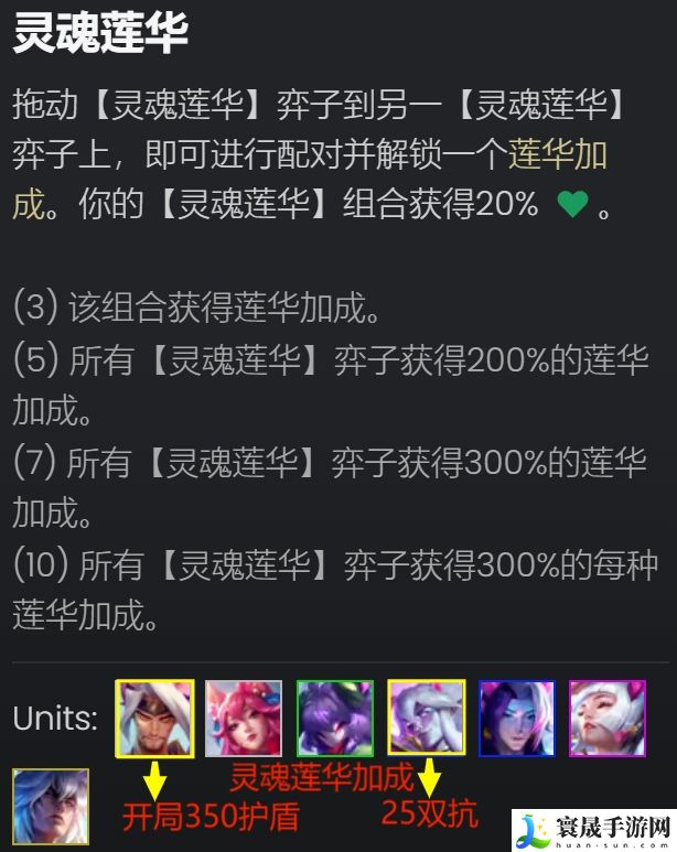 而亚索的加成是开局获得350护盾,锤石的加成是25双抗,这样在7羁绊下,所有莲华棋子开局都可获得1050护盾(350*3)与75双抗(25*3),这就是阵容的坦度极大幅度加强。
