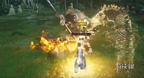 2、大世界-正面: 在角色左侧出现一个亮眼的金龙,喷出明黄色的火焰。