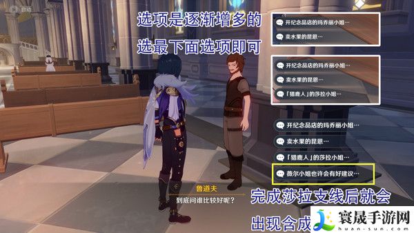 一开始只能问玛乔丽和昆恩,随着任务进展会出现莎拉和薇尔,因为新出现的都在最下方,所以直接选最下方选项就可以了。