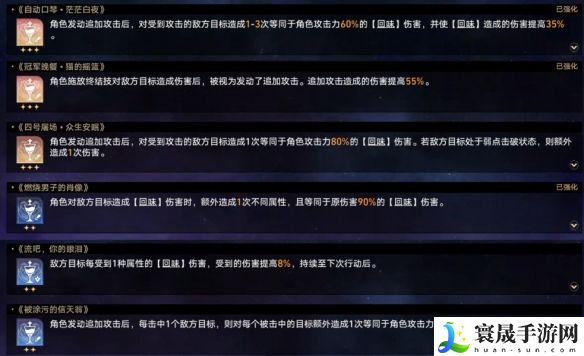 回响交错:回响交错只激活“与巡猎相关的回响交错”,可以让主C有个额外拉条手段。另一个与虚无的交错则不推荐激活,因为50%概率还是太低了,打到后面基本都是被抵抗掉的。