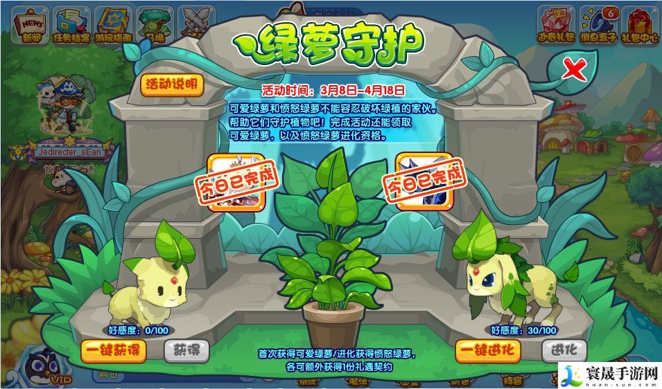 当可爱绿萝与愤怒绿萝好感度达到100点,就可以领取/进化宠物啦!