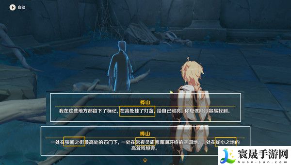 对话得知,需前往狭间之街、常夜灵庙、蛇心之地,三处位置看风景,这些地方在高处挂了灯盏