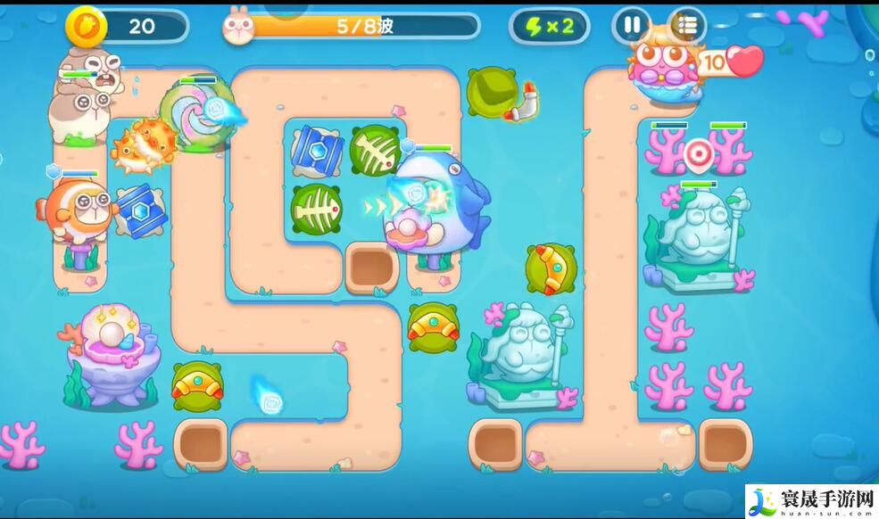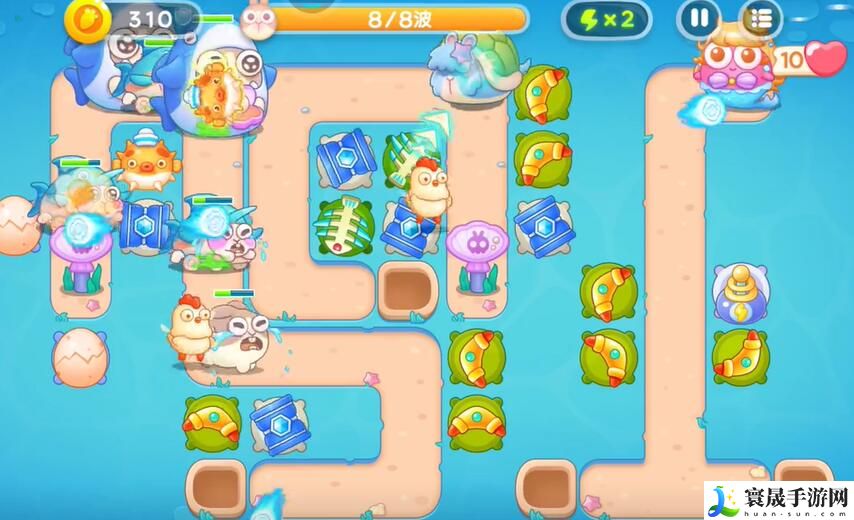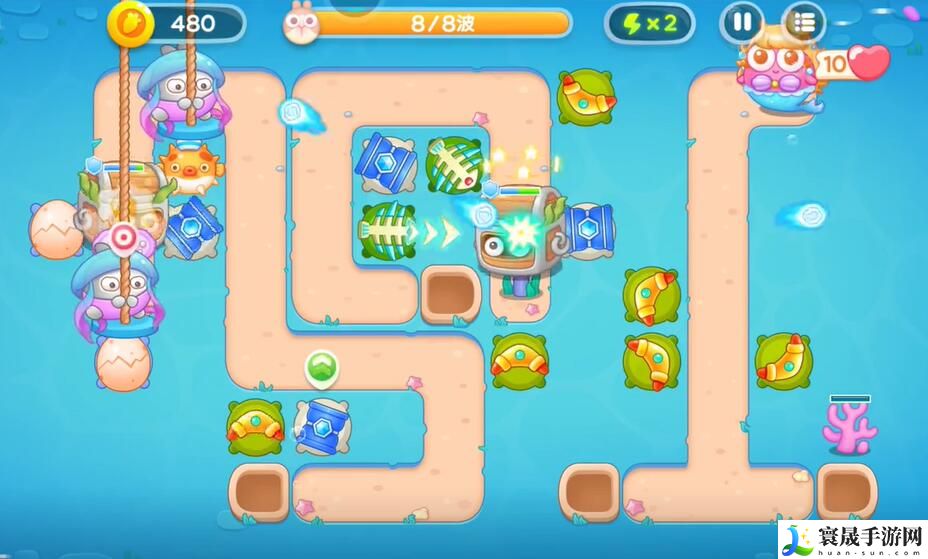 2、在左侧的双向塔上方建造一个河豚,中间出怪口的下方建造一个回旋镖对兔子进行攻击。