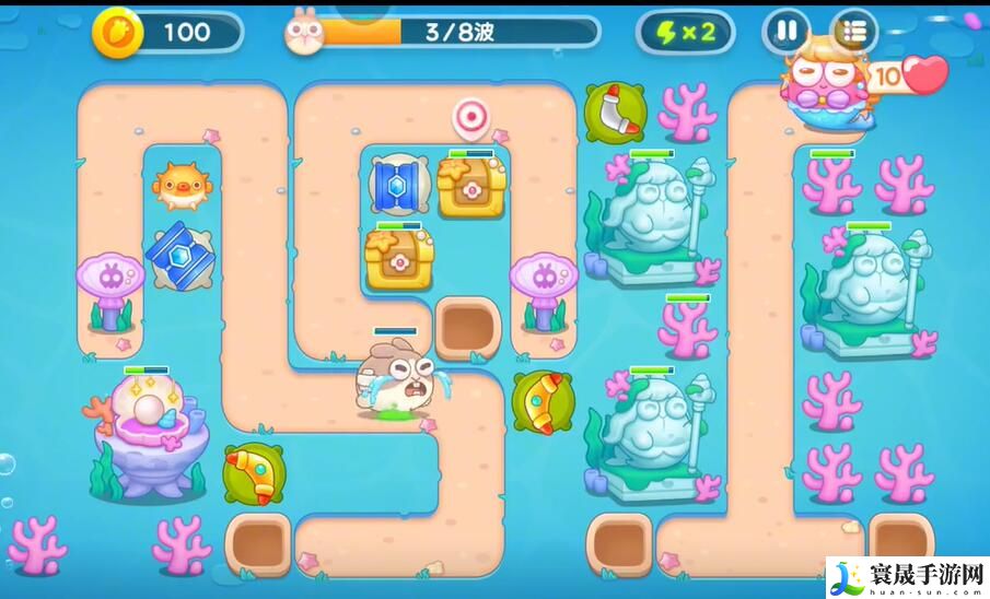3、在地图的两个宝箱边上建造双向塔,右侧建造一个回旋镖,对兔子和障碍物进行输出。