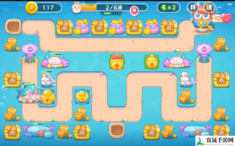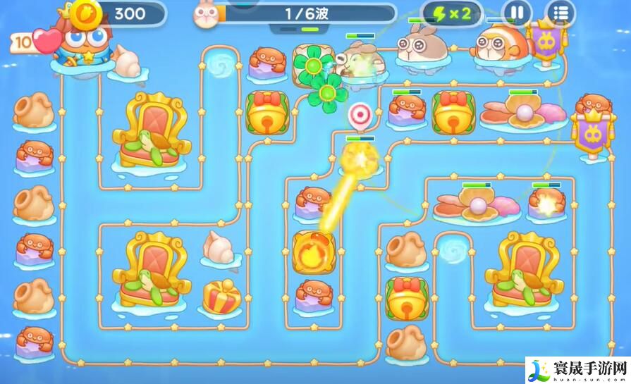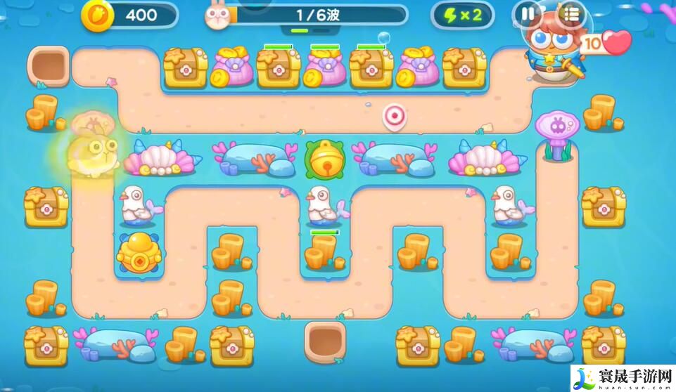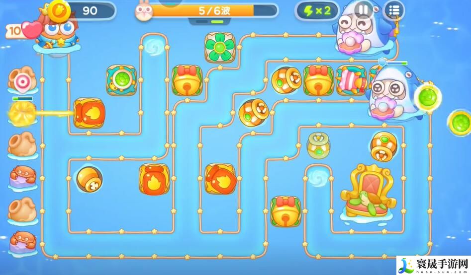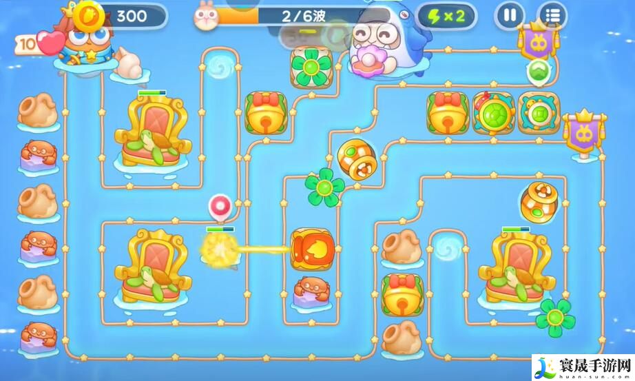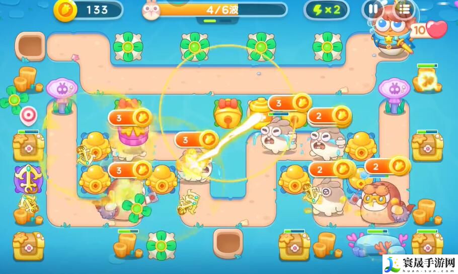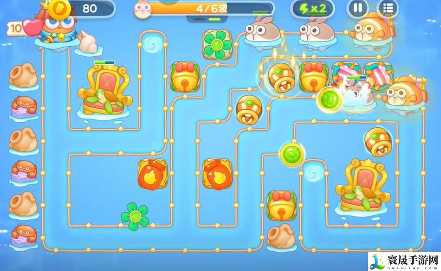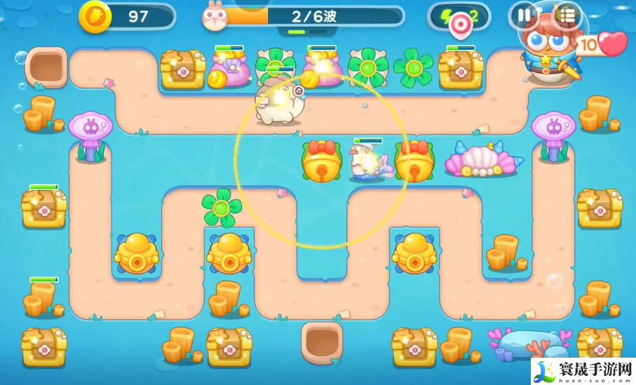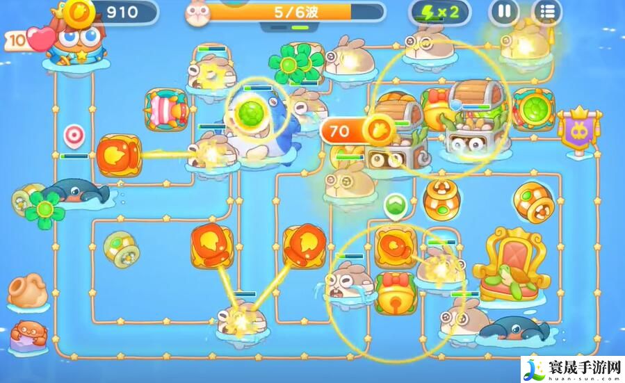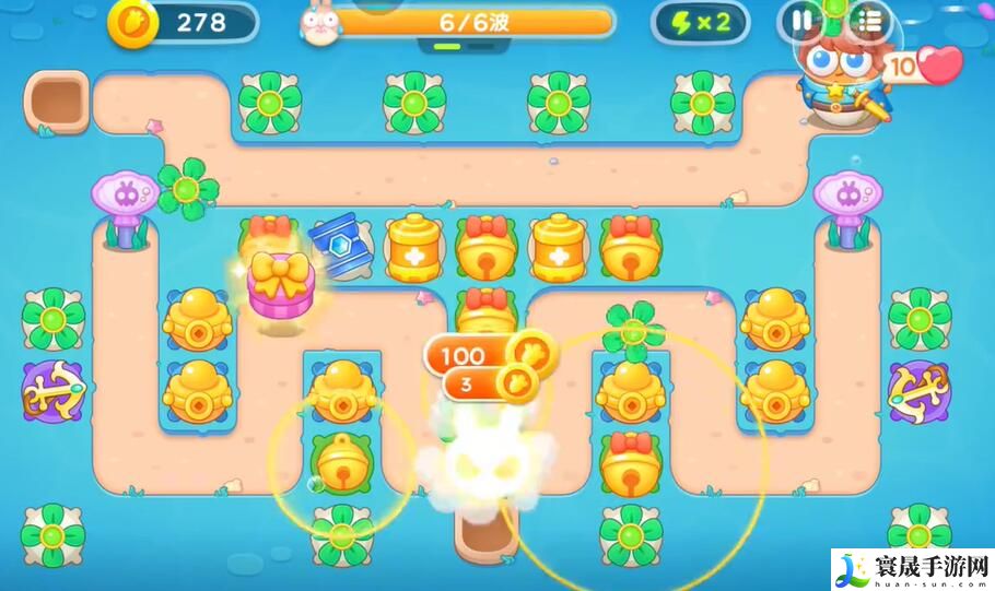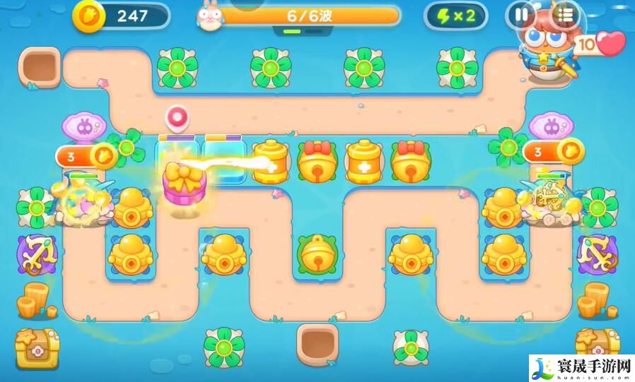 3、摧毁顶端的宝箱可以获得风扇,并且对其进行升级,用来对兔子进行补刀,在地图的右下方建造一个元宝。