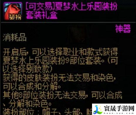 通过多买多送购买“[可交易]夏梦水上乐园装备套装礼盒”,打开可获得别致款装扮、别致款武器装扮;