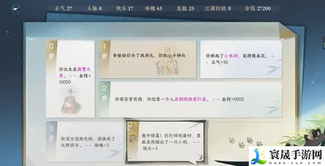 3、物色侠客,队伍中有面色不善之人,选第一个,成功金钱+30%,江湖经验+5。失败金钱-18%,体魄-3。