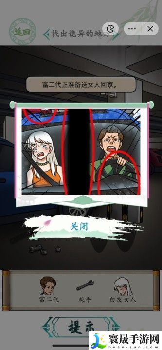 3、拖动富二代开车,副驾驶白发女人,点击后面红色车、方向盘、中间的黑色部分。