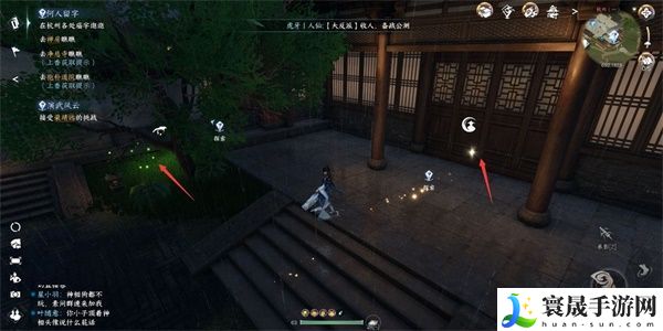 2、首先我们前往第一位置:灵隐寺,在745,1318附近使用探索动作上香就会触发剧情,我们按照NPC的指引去附近的禅房进行查看,我们进入到禅房之后,需要先于树下的萤火虫就那些互动,进入到禅房之后,按照下-左-右-上-下的顺序依次坐蒲团就可以解开机关,打开宝箱。