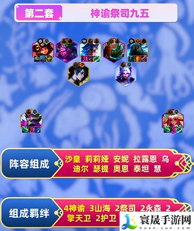 组成羁绊:4神谕、3山海、2祭司、2永森、2擎天卫、2护卫、2夜幽、1画圣