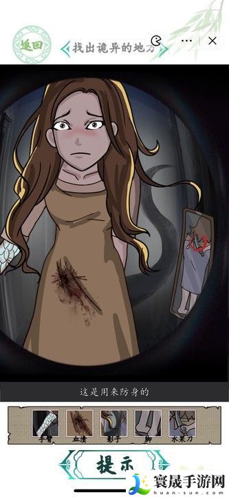 4.第三个场景点击水果刀、脚、影子、血渍、手。