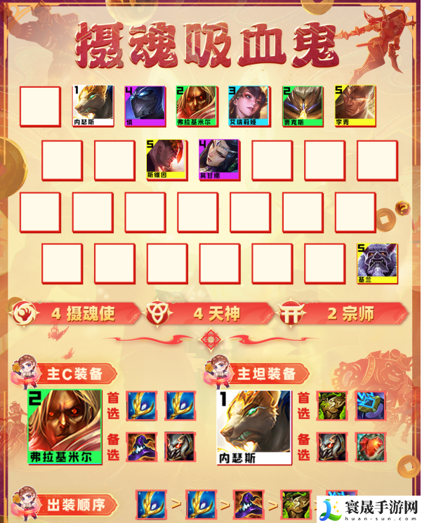 1.金铲铲之战不死流吸血鬼阵容组成:内瑟斯、弗拉基米尔、莫甘娜、斯维因(4摄魂使)、贾科斯、艾瑞利亚、李青、慎、风女/基兰