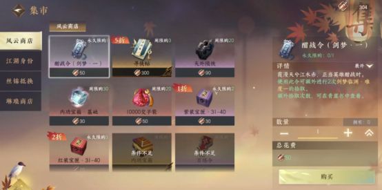 5、然后可以去打世界BOSS,我建议可以去打磁州的BOSS。而副本剑梦临渊的话,打完一次以后可以去风云商店以及世界探索去得到酣战令(2个),这个东西主要是用来获得额外的奖励的。当然,风云商店里面的紫装宝匣也是要买的。
