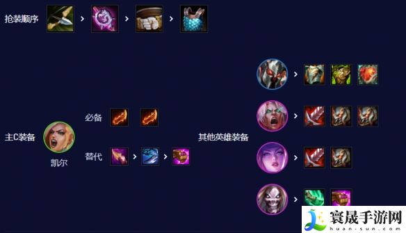 天使自带魔抗击碎,无需做离子或电刀减魔抗。副C装备优先给佛耶戈做,佛耶戈在这个版本获得加强。优选饮血泰坦、血手等半肉战士装。法强装多给死歌做装备,回蓝装青龙刀头盔做一件,输出装可以做帽子、大天使、法爆。
