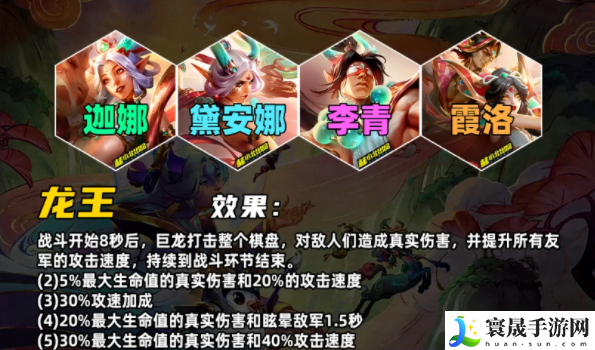 战斗开始8秒后,龙会击打所有敌军,造成真实伤害并给所有友军攻速加成,持续到回合结束。和S7的风暴龙羁绊类似