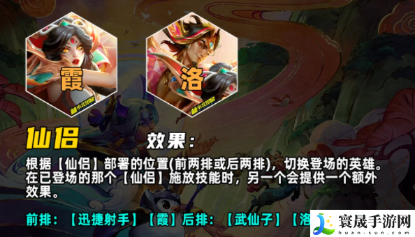 当一名登场的仙侣施法时,另一半会在场边提供额外增益霞登场时:洛会向生命值最低的n名友军投掷羽刃,为其治疗生命值。此技能会受到【迅捷射手】影响洛登场时:霞会对所有被洛技能命中的敌人造成物理伤害